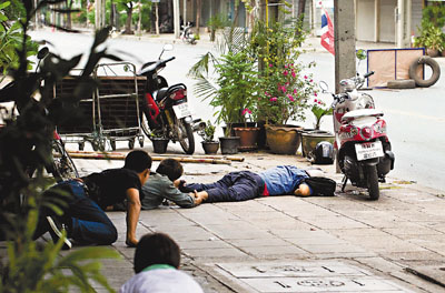 中新網5月16日電 據香港《文匯報》報道,曼谷街頭腥風血雨,來自泰北的33歲示威者塞達15日留守紅衫軍陣地,站在用竹枝、車胎和有刺鐵絲網搭成的護欄旁把守,緊張地測試手上的彈弓,想到剛有19人死了,他說:“我不知道接下來會如何,我害怕,但沒選擇,我們全都害怕會死!