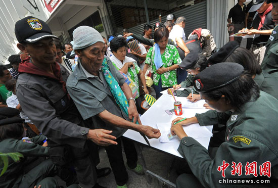 在警察總署等待回家的抗議者身邊都放著自己的家當,有些人神情沮喪,但仍有不少人仍然保持泰國人的輕松態(tài)度,在等待時談笑。離開的時候,一個婦人微笑著對記者揮手,男人們則神情肅穆地接受軍人檢查。