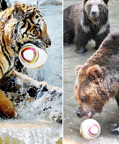 中新網(wǎng)6月10日電 據(jù)韓國《中央日報》網(wǎng)站報道,2010年南非世界杯開賽在即,動物們也喜歡世界杯,加入了如炎熱的天氣般熾熱的世界杯浪潮。在韓國,動物園內(nèi)的老虎和熊在水中興致勃勃地玩起了足球。