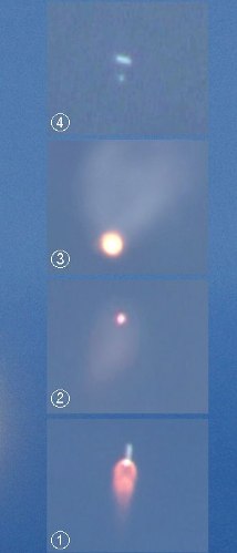 韓國最大的國營電視臺KBS拍到的畫面顯示:①圖升至距地面70公里高空的“羅老”號的火焰開始是紅色的,②圖接著火焰變大,呈現(xiàn)類似爆炸后的景象,③火焰越變越大,并向下掉落。④火焰消失后,被推測認為是“羅老”號的白色物體開始向下墜落。