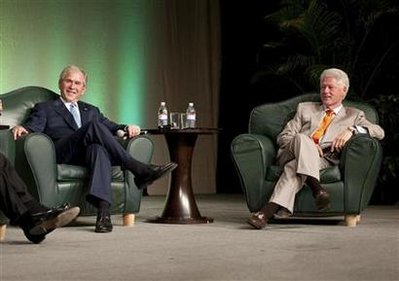 克林頓卸任后,多次與布什的父親、即前總統(tǒng)老布什合作,例如替南亞海嘯及超級颶風“卡特里娜”天災的災民籌款,兩人有一段時間經(jīng)常走在一起。布什開玩笑道,不知道自己的父親花了多少時間與克林頓同場亮相。