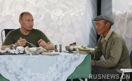 當(dāng)普京在一個無人的山地停留時發(fā)現(xiàn)一群羊,一名當(dāng)?shù)氐哪裂蛉苏诜叛。普京邀請牧羊人與他一起喝茶,而牧羊人回請普京到他的住處去看看。普京同意之后,牧羊人返回家中,過了一會兒,他和自己的兒子一起同返回,還為普京牽來一匹馬。