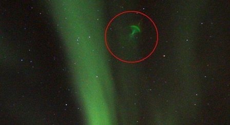 在一張他于1月21日拍攝的照片中,右上方有一個像綠色水母,又像降落傘的奇怪物體。米凱森描述說,“這個物體影像具有跟北極光相同的綠色。這意味著北極光是造成這個物體成影的光源!