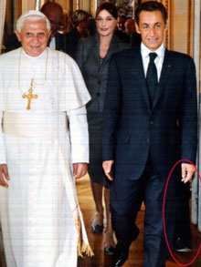 法國《巴黎競賽畫報(bào)》日前刊登了一張法國總統(tǒng)薩科齊和第一夫人卡拉·布呂妮9月12日在巴黎愛麗舍宮接見羅馬教皇本篤十六世的照片,但這張照片卻讓雜志讀者們大感驚詫,因?yàn)槿藗儼l(fā)現(xiàn),法國總統(tǒng)薩科齊的左腿邊竟然憑空多出一條腿,可他左邊看起來并沒有站著其他人,就好像薩科齊本人長出了“3條腿”一樣!