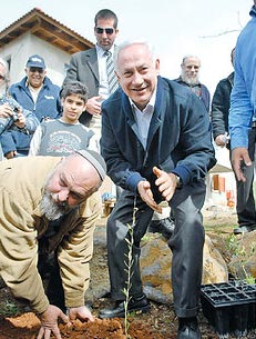 在黨內(nèi)鷹派人物班尼·貝京、前以色列總參謀長(zhǎng)摩西·亞阿隆以及戈蘭高地當(dāng)?shù)鼐用癜啤ひ了返呐阃,?nèi)塔尼亞胡親手栽下兩棵桉樹(shù)苗,發(fā)誓永遠(yuǎn)不會(huì)將這塊土地拱手相讓。內(nèi)塔尼亞胡還帶著兒子阿費(fèi)納,他發(fā)誓稱,阿費(fèi)納的子子孫孫會(huì)一直坐在這棵樹(shù)下。