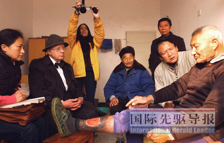 78歲的盛益銀小心翼翼地挽起褲腳,露出結(jié)了痂的右腿。坐在一旁的邁克爾•弗蘭茨布勞俯下身摸了摸,然后從發(fā)病的時(shí)間、癥狀到如何得到救治一一詢問起來。