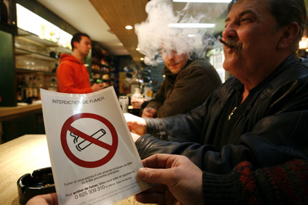 煙霧彌漫一直是法國(guó)人泡吧的特色,但為了跟上全民健康的歐洲潮流,法國(guó)終于從今年元月開(kāi)始對(duì)28萬(wàn)家咖啡館、酒吧和餐館等娛樂(lè)型公共場(chǎng)所實(shí)行禁煙令,成了歐洲最后一個(gè)實(shí)行類似禁令的國(guó)家。按照法規(guī),如果有煙民在公共場(chǎng)所不幸被執(zhí)法者逮到,每次將被罰68歐元,允許他吸煙的公共場(chǎng)所經(jīng)營(yíng)者也將面臨135歐元至750歐元的罰款。另一方面,為配合戒煙,政府還煞費(fèi)苦心地將戒煙藥列入國(guó)家補(bǔ)助范圍。