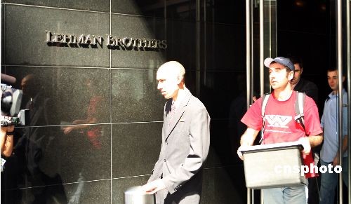 9月15日,美國有著158年歷史的第4大投資銀行雷曼兄弟公司于向法院申請破產保護,員工當日從雷曼兄弟公司位于紐約的總部大樓內將清理的辦公用品搬離公司。中新社發(fā) 鄧悅 攝