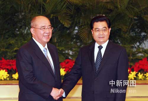 五月二十八日下午,中共中央總書(shū)記胡錦濤在北京人民大會(huì)堂會(huì)見(jiàn)中國(guó)國(guó)民黨主席吳伯雄一行。 廖文靜 攝