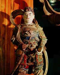 救苦天尊殿:三國時,群雄逐鹿,連年混戰(zhàn),原始鬼魂也乘機出沒人間騷擾百姓。天尊得知鬼魂作怪,便將手中拂塵一揮,使鬼魂消散。百姓抬頭一望,只見一九頭青獅上馱著救苦天尊,再看一位戴官帽的神仙帶領(lǐng)十八神將收了鬼魂。原來是太一救苦天尊領(lǐng)城隍及十八陰司傾城出動。后人便自發(fā)捐資修建了天尊殿。自那以后,就有了城隍三出巡,治理鬼魂,使百姓安寧的說法。