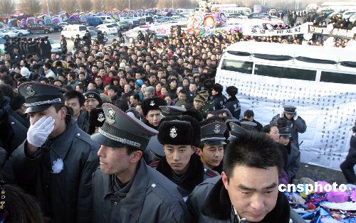 1月7日上午,烏魯木齊市燕兒窩殯儀館,萬余名烏魯木齊市民悼念在“1.2”火災(zāi)中犧牲的消防戰(zhàn)士朱曉雷、張宇、高峰3位烈士。朱曉雷、張宇、高峰的英雄事跡在社會上引起強(qiáng)烈反響,新疆各族群眾自發(fā)前往吊唁。自治區(qū)人民政府追授三位烈士為“模范消防衛(wèi)士”,公安部批準(zhǔn)他們?yōu)楦锩沂,自治區(qū)團(tuán)委追授三位烈士“新疆青年五四獎(jiǎng)?wù)隆,自治區(qū)公安廳授予三位烈士“優(yōu)秀共產(chǎn)黨員”榮譽(yù)稱號。中新社發(fā) 李雄心 攝