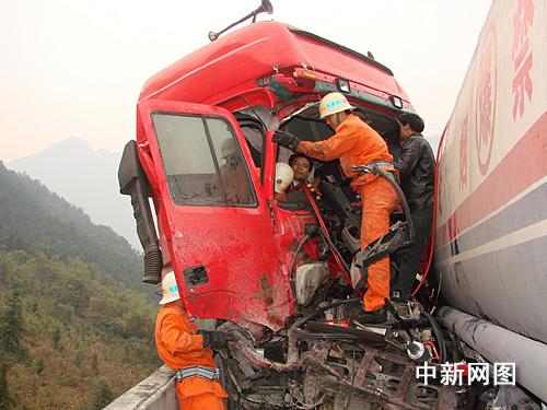 交警在南行東坪和梅花出口和北行乳源出口實施車輛分流制,并在南行云巖坡頂實施臨時禁行交通管制。消防官兵則兵分兩路,一組人員著防化服佩戴空氣呼吸器對危險品運輸車實施堵漏,另一組對追尾貨車內(nèi)被困人員進行救援。經(jīng)過消防官兵近一個小時的奮力營救,于10時55分將被困人員救出,并及時送往醫(yī)院救治。