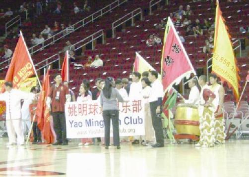6)中國功夫走進(jìn)火箭隊賽場,太極少林和秧歌為姚明助威----12月31日晚,NBA火箭隊舉行2007年最后一場比賽開始前,由休斯頓姚明球迷俱樂部等單位組織的中國功夫表演隊伍大張旗鼓地出現(xiàn)在豐田中心的賽場上,具有濃郁中華民族文化特色的太極、少林和秧歌到這里為火箭姚明助威來了。由黃曉明,程進(jìn)才,釋行浩和喬鳳祥等率領(lǐng)的太極,少林和秧歌隊伍在豐田中心向美國主流社會大展中華文化之精粹。