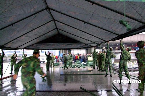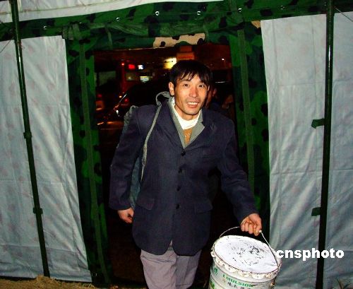 1月27日,南京軍區(qū)“硬骨頭六連”所在師接到杭州市政府請求支援電話,派出200余名工兵,火速趕往杭州火車站。官兵們寒著風(fēng)雪嚴寒,很快搭設(shè)好12頂野戰(zhàn)帳篷,并在帳篷里鋪設(shè)了草墊子,為滯留旅客提供休息之地。滯留在車站的民工旅客走進野戰(zhàn)帳篷,臉上露出笑容,高興地說:今晚不會挨凍了,感謝黨和人民解放軍。據(jù)車站負責(zé)人介紹,因冰雪天氣影響,這天約有2萬名旅客滯留杭州火車站。中新社發(fā) 邱柏星 攝