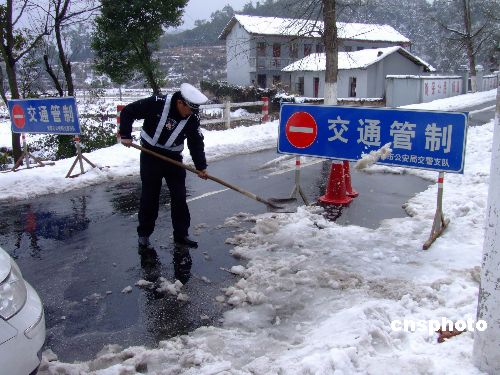 1月中旬以來,江西宜春遭遇幾十年一遇的冰雪災(zāi)害天氣。2月3日上午,江西宜溫公路被迫關(guān)閉,宜春交警冒著嚴(yán)寒疏導(dǎo)交通,11點(diǎn)30分實(shí)現(xiàn)單線行車。中新社發(fā) 彭小榕 攝