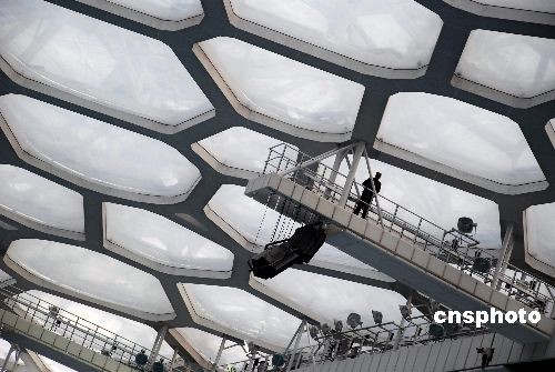 解放軍工兵正對北京奧運(yùn)場館“水立方”頂層實施安全檢查。