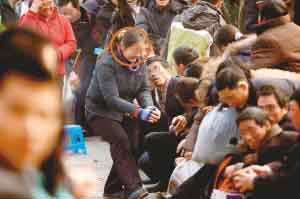 回到隊(duì)伍末端,瘦小男子只得重新排隊(duì)。他一臉無(wú)辜的自稱涪陵區(qū)人,名叫孫文件,在天津打工,從13日便開始候票。孫先生告訴記者,排在隊(duì)伍前面的一半左右的人都是票販子。他說(shuō),之所以這么肯定這些插隊(duì)的人是票販子,是因?yàn)樗J(rèn)得其中一個(gè),那個(gè)人13日下午向他兜售過(guò)到北京的硬坐車票,加價(jià)250元,他沒(méi)敢要。