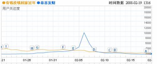 “艷照門”事件也成為春節(jié)期間的熱門話題。報(bào)告指出,每天有數(shù)百萬網(wǎng)民搜索相關(guān)關(guān)鍵詞,更有超過千萬的人在網(wǎng)絡(luò)上搜索圖片。在百度指數(shù)中,陳冠希的關(guān)注度1月內(nèi)猛增80倍,而阿嬌的關(guān)注度也增加了30倍,事件的其余女主角張柏芝、陳文媛的關(guān)注度也增加了10倍以上。