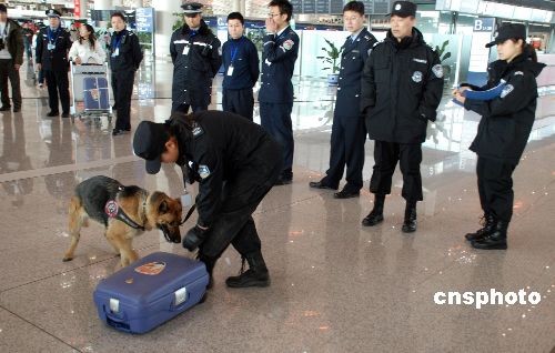 圖為機場工作人員正在利用警犬檢測行李中的危險品。