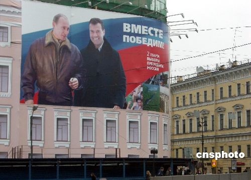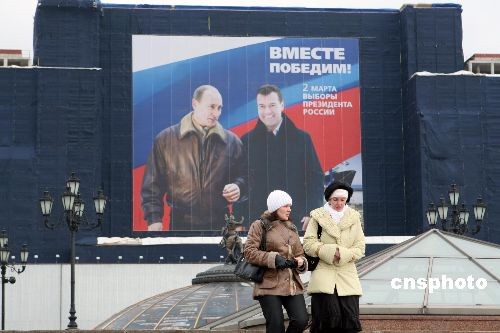 3月1日,在莫斯科紅場(chǎng)旁邊,現(xiàn)任俄羅斯總統(tǒng)普京與政府第一副總理、下屆總統(tǒng)的熱門侯選人梅德韋杰夫的巨幅海報(bào),上書“我們攜手贏取勝利”十分醒目。梅德韋杰夫曾多次表示,他若當(dāng)選后將繼續(xù)執(zhí)行普京路線。3月2日,俄羅斯將舉行總統(tǒng)大選。中新社發(fā) 田冰 攝