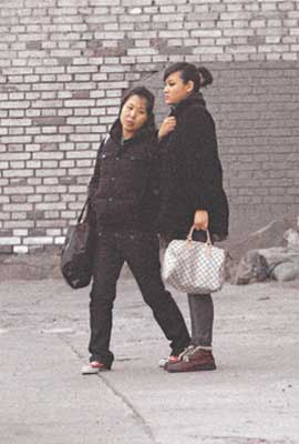 田亮太太葉一茜(右)由影樓步出,穿著大褸的她仍遮掩不住懷孕已7個(gè)月的大肚。