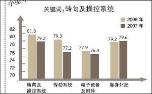 在對去年初始質(zhì)量滿意度的測評指標(biāo)中,緊湊型轎車“發(fā)動機(jī)”環(huán)節(jié)滿意度得分最高,“電子設(shè)備及附件”環(huán)節(jié)滿意度得分最低。初始質(zhì)量各環(huán)節(jié)滿意度均低于2006年得分,“轉(zhuǎn)向及操控系統(tǒng)”滿意度降幅最大。