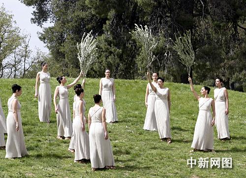 希臘當(dāng)?shù)貢r(shí)間3月24日,北京二00八年奧運(yùn)會(huì)圣火采集儀式在古奧林匹亞競(jìng)技場(chǎng)舉行,最高女祭司順利采集到火種。女祭司手擎橄欖枝不斷變幻隊(duì)形,在山坡上舞蹈。中新社記者 王歡