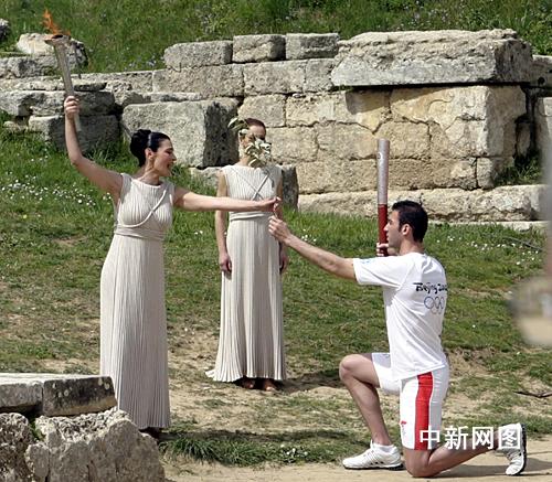 希臘當(dāng)?shù)貢r(shí)間3月24日,北京二00八年奧運(yùn)會(huì)圣火采集儀式在古奧林匹亞競(jìng)技場(chǎng)舉行,最高女祭司將橄欖枝傳遞給第一火炬手希臘運(yùn)動(dòng)員亞歷山大,并用古希臘語(yǔ)對(duì)他說(shuō):“將圣火傳遞給世界,告訴人們奧運(yùn)會(huì)就要開(kāi)始了。 中新社記者 王歡
