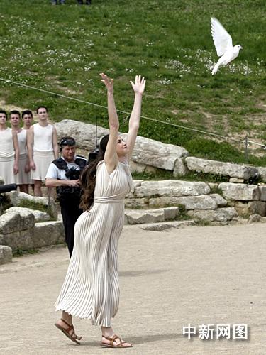 希臘當?shù)貢r間3月24日,北京二00八年奧運會圣火采集儀式在古奧林匹亞競技場舉行,最高女祭司順利采集到火種。一名女祭司手捧白鴿走到眾人之前,面向古競技場放飛白鴿。 中新社記者 王歡