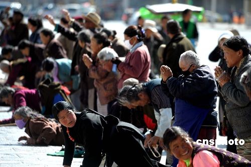 眾多信眾在布達(dá)拉宮廣場上叩首。中新社發(fā) 廖攀 攝