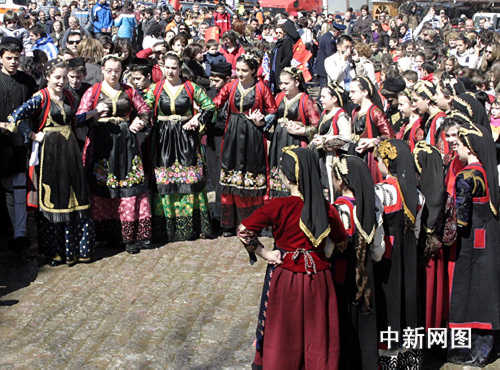 3月26日,北京奧運(yùn)會圣火希臘境內(nèi)傳遞第三日,抵達(dá)冰雪覆蓋的山城邁措翁。青少年跳起希臘傳統(tǒng)舞蹈歡迎奧運(yùn)圣火。中新社記者 王歡