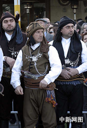 3月26日,北京奧運會圣火希臘境內(nèi)傳遞第三日,抵達當天最后一個城市韋里亞。當?shù)厥忻袷⒀b參加慶典儀式。中新社記者 王歡