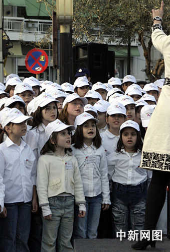 3月26日,北京奧運(yùn)會(huì)圣火希臘境內(nèi)傳遞第三日,抵達(dá)當(dāng)天最后一個(gè)城市韋里亞。當(dāng)?shù)貎和莩獖W林匹克會(huì)歌和希臘國(guó)歌。中新社記者 王歡