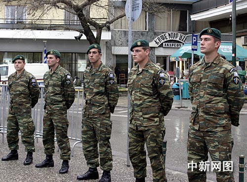 3月27日,北京奧運(yùn)圣火希臘境內(nèi)傳遞第四天,山城納烏薩迎來第一個(gè)慶典儀式。當(dāng)?shù)夭筷?duì)派出軍人維護(hù)儀式會(huì)場(chǎng)治安。中新社記者:王歡