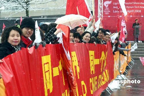圖為中國留學(xué)生在溫布利體育場外為奧運(yùn)圣火助威。 沈晨 攝
