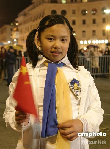 希臘當(dāng)?shù)貢r間3月27日,北京奧運圣火希臘境內(nèi)第四天傳遞,在當(dāng)天的終點塞薩洛尼基舉行慶典儀式。圖為童聲合唱團中唯一的華人女孩王佩珺。 王歡 攝