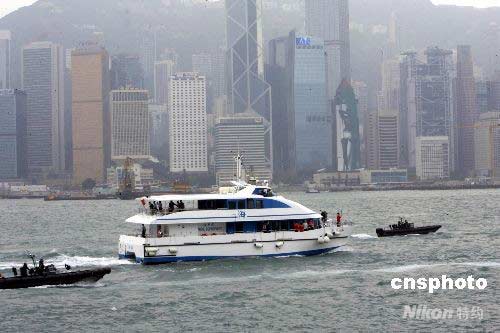 香港舉行北京奧運火炬?zhèn)鬟f路線預(yù)演,維港海上數(shù)艘警用巡邏艇、快艇、護送火炬?zhèn)鬟f游輪過海,消防船在維港射水致意、飛機空中盤旋護駕。 王麗南 攝