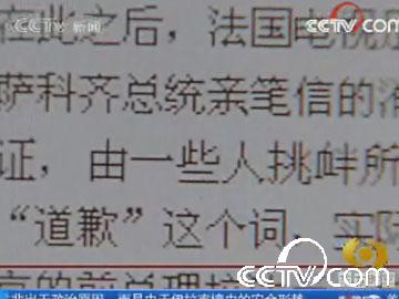 法國電視足足花了7分多鐘的時間報道與中國有關的4條消息。首先是法國參議院議長向金晶轉交薩科齊總統(tǒng)親筆信的消息。破天荒地在屏幕上打出薩卡奇信件的一句關鍵的話:“我在此向您保證,由一些人挑釁所引起的事件并不反映我的同胞們對中國人民的情感”。主持人說,雖然沒有明說“道歉”這個詞,實際上現(xiàn)在是法國人道歉尋求和解的時候了。