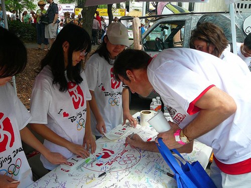 在現(xiàn)場(chǎng)擺設(shè)的“簽名支持北京奧運(yùn)”攤位前,光臨這里的美國客人從開攤到收攤一直絡(luò)繹不絕。有許多美國朋友在聽留學(xué)生們講完關(guān)于“北京奧運(yùn)對(duì)于中國人民的重大意義”, “北京奧運(yùn)目前的籌備情況”等話題之后,當(dāng)即表示,我們完全支持你們的北京舉辦這屆奧運(yùn)會(huì),我們不同意任何人提出的“抵制北京奧運(yùn)”的任何理由。有幾位曾經(jīng)到過北京的美國人對(duì)他們的同伴介紹說:我門去過北京的,那是一個(gè)既古老又新興的漂亮城市,在北京舉辦奧運(yùn)會(huì),絕對(duì)是本屆奧運(yùn)會(huì)的最佳選擇! 他們都十分肯定地在由中國留學(xué)生準(zhǔn)備的簽名大橫幅上簽下了自己的名字。