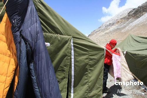 圖:珠峰大本營記者抓緊時機(jī)晾曬臥具 (2)