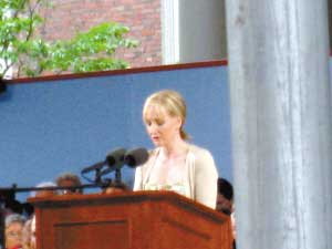 6月5日14時(shí)30分,繼上午的學(xué)位頒發(fā)儀式結(jié)束之后,哈佛大學(xué)的畢業(yè)慶典儀式繼續(xù)進(jìn)行,而其中的重頭戲就是《哈利·波特》作者J·K·羅琳的演講。盡管下著毛毛細(xì)雨,擺了兩萬多把椅子的哈佛園(Havard Yard,哈佛主校區(qū))仍然座無虛席。參加慶典的學(xué)生親友中,不乏表情雀躍的小朋友。身穿淺色花裙、外著米色外套、手握紅色坤包的羅琳甫一出現(xiàn),全場便一陣騷動(dòng),并響起了長時(shí)間的掌聲。
