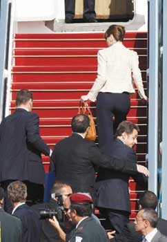 薩科齊的妻子布呂尼花容失色,搶在丈夫前頭登機。