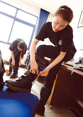 李亞麗穩(wěn)穩(wěn)當(dāng)當(dāng)?shù)伛{著摩托車圍著場(chǎng)地繞了一圈。那些從沒(méi)開(kāi)過(guò)摩托車的姐妹們可就沒(méi)那么穩(wěn)當(dāng)了。25歲的“警花”甄珍,1米74的個(gè)頭,曾在警官樂(lè)團(tuán)擔(dān)任打擊樂(lè)聲部長(zhǎng),隨團(tuán)出訪日本參加世界警察音樂(lè)會(huì)。2002年從警校畢業(yè)后分配到車管所工作。性格開(kāi)朗的她平時(shí)喜歡健身、看書(shū)、聽(tīng)音樂(lè)。這次被調(diào)入帶路隊(duì),心里甭提多高興了,“騎著摩托車、頭戴耳麥?zhǔn)筋^盔、腳蹬馬靴、全身披掛著直接為奧運(yùn)會(huì)服務(wù),甭提多威武了!笨僧(dāng)她和女隊(duì)員們看到眼前這些自重都在500斤以上的大排量摩托車時(shí),卻傻了眼兒。這哪是摩托車呀,簡(jiǎn)直是條船。