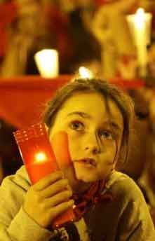 15日凌晨,一個小女孩手舉蠟燭參加西班牙奔牛節(jié)閉幕活動。