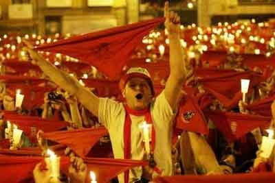15日凌晨,成千上萬的狂歡者聚集到潘普洛納市政廳前,手舉蠟燭和紅絲巾參加奔牛節(jié)閉幕活動。