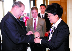 象征奧運(yùn)五環(huán)的五色絲線上下翻飛,在一個個社區(qū)“巧娘”手中,一串串寓意吉祥、造型精美的中國結(jié)手鏈在奧運(yùn)前夕趕制完畢。昨天,純手工編織的“吉祥鏈”戴到了國際奧委會主席羅格的手腕上。