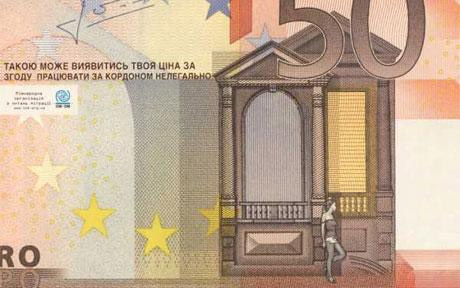 這套樣鈔分別面值5歐元、10歐元和50歐元,雖然屬于正常渠道發(fā)行,但是不能流通。與真幣的差別在于,這些鈔票的背面圖案上均添加了一個僅身著內衣的妓女形象,搔首弄姿的倚靠在歐洲一些著名的建筑物旁。樣鈔背面左上方的位置還寫有一句警示語,警告那些想通過非法途徑來歐盟國家務工的人要考慮清楚為此付出的代價。由于添加的圖案較小,隱藏在傳統(tǒng)歐元鈔票的圖案中,因此如果不是仔細分辨,樣鈔足以以假亂真。