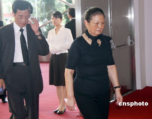 臺(tái)塑企業(yè)創(chuàng)辦人王永慶的遺體十七日由長(zhǎng)榮班機(jī)運(yùn)抵臺(tái)灣,靈堂設(shè)在桃園縣的長(zhǎng)庚大學(xué)活動(dòng)中心。圖為王永慶的夫人李寶珠步入靈堂。中新社發(fā) 耿軍 攝