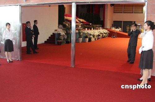 臺(tái)塑企業(yè)創(chuàng)辦人王永慶的遺體十七日由長榮班機(jī)運(yùn)抵臺(tái)灣,靈堂設(shè)在桃園縣的長庚大學(xué)活動(dòng)中心。圖為靈堂入口處。中新社發(fā) 耿軍 攝