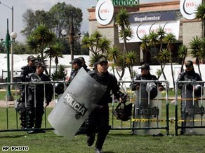 哥倫比亞防暴警察在DMG公司門外維持秩序。